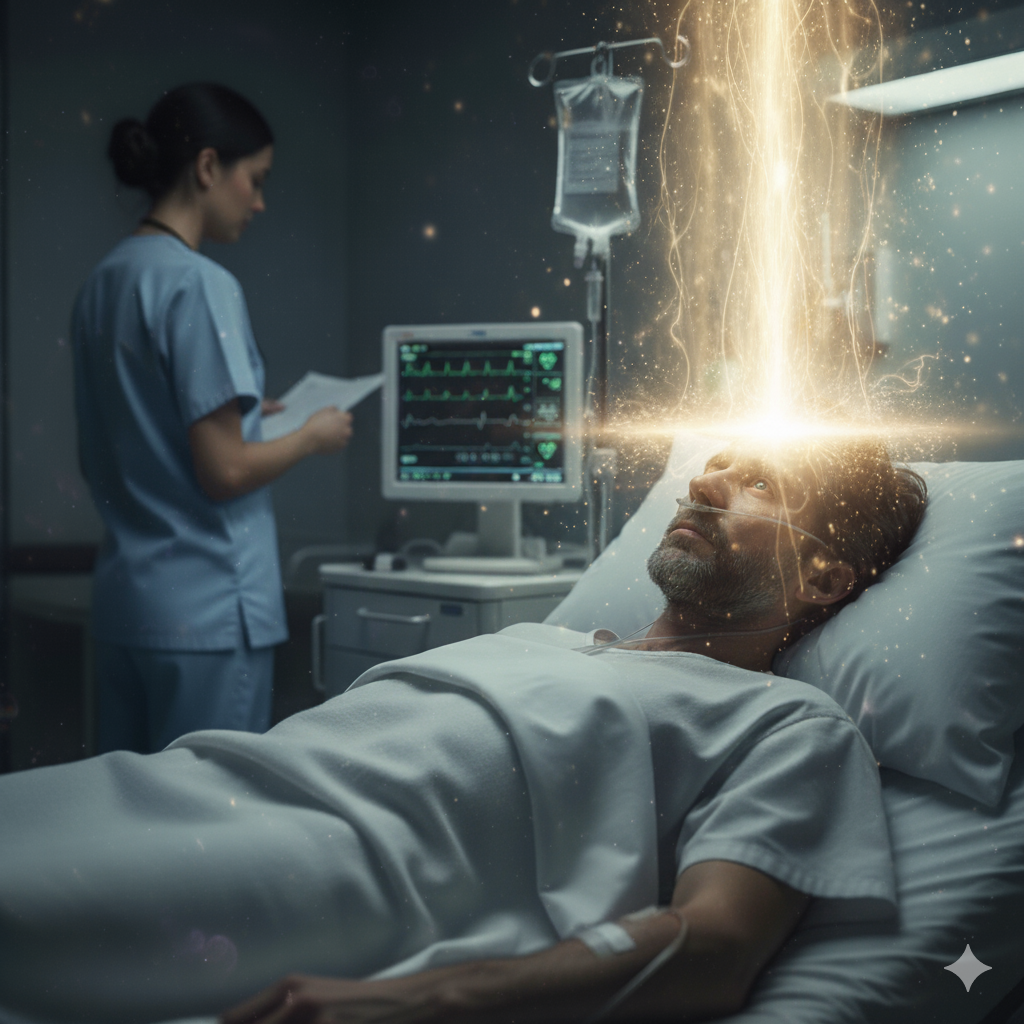 While he was in that healing presence of God, Arlin looked up to see its source—a being on a throne in another dimension, very high up. The light was too blinding for him to see details, so he looked around and saw others near him, and saw that they, too, radiated different degrees of light, and all were connected to that being on the throne — we all trace to Him; He is literally The Father.